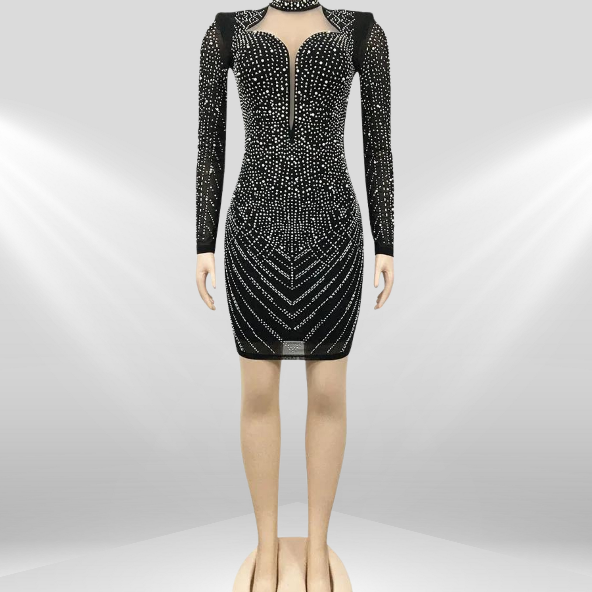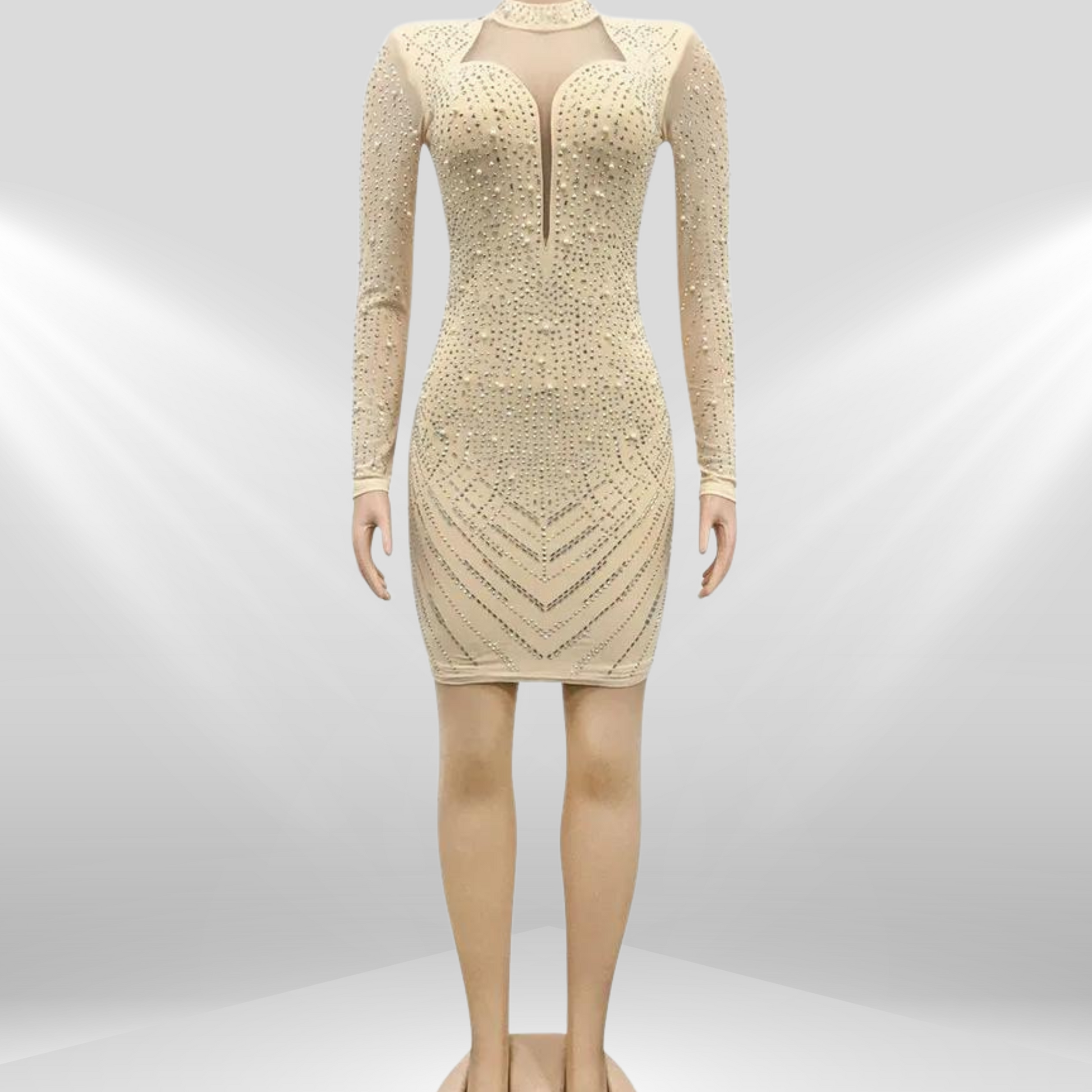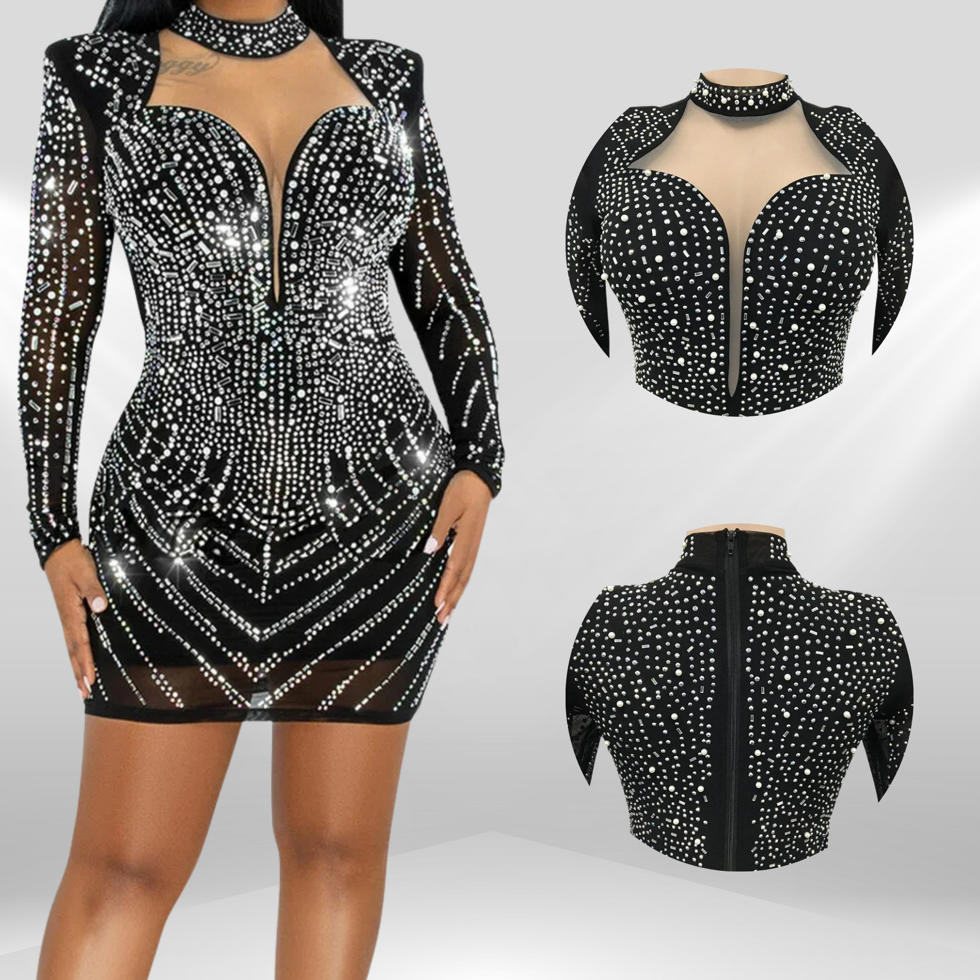 Dazzling Evening Elegance: Sparkling Rhinestone Adorned Bodycon | Sophisticated Long-Sleeve & Mock Neck Silhouette