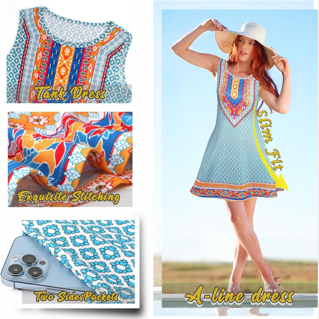 Women's Summer Dresses Tshirt Sundress Sleeveless with Pockets Casual Loose Tank Floral PrintDress